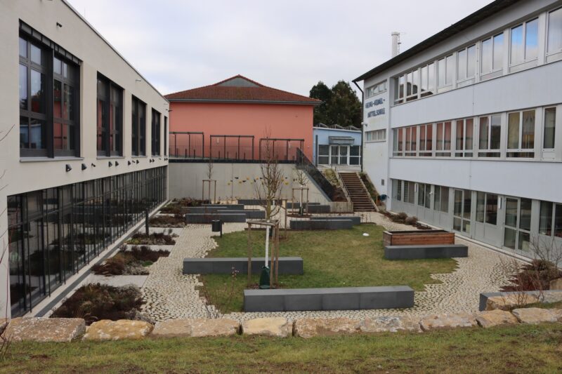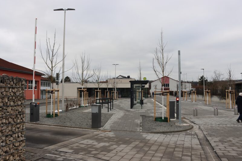 Etwas trostlos sieht die Umgebung am Schulkampus aus. Bleibt zu hoffen, dass die Bäume schnell wachsen. Nach Abschluss der Bauarbeiten ist der neue Schulcampus, bestehend aus Mittelschule, Grundschule, Sporthalle und Mensa, nun vollständig nutzbar. Während der Schulzeiten bleibt das Gelände autofrei und wird durch versenkbare Poller abgegrenzt. Allerdings sieht die örtliche Gliederung von Bündnis 90/Die Grünen erhebliche Mängel im Verkehrskonzept, insbesondere im Bereich des Hol- und Bringverkehrs sowie der Wegeführung für Fußgänger und Radfahrer.